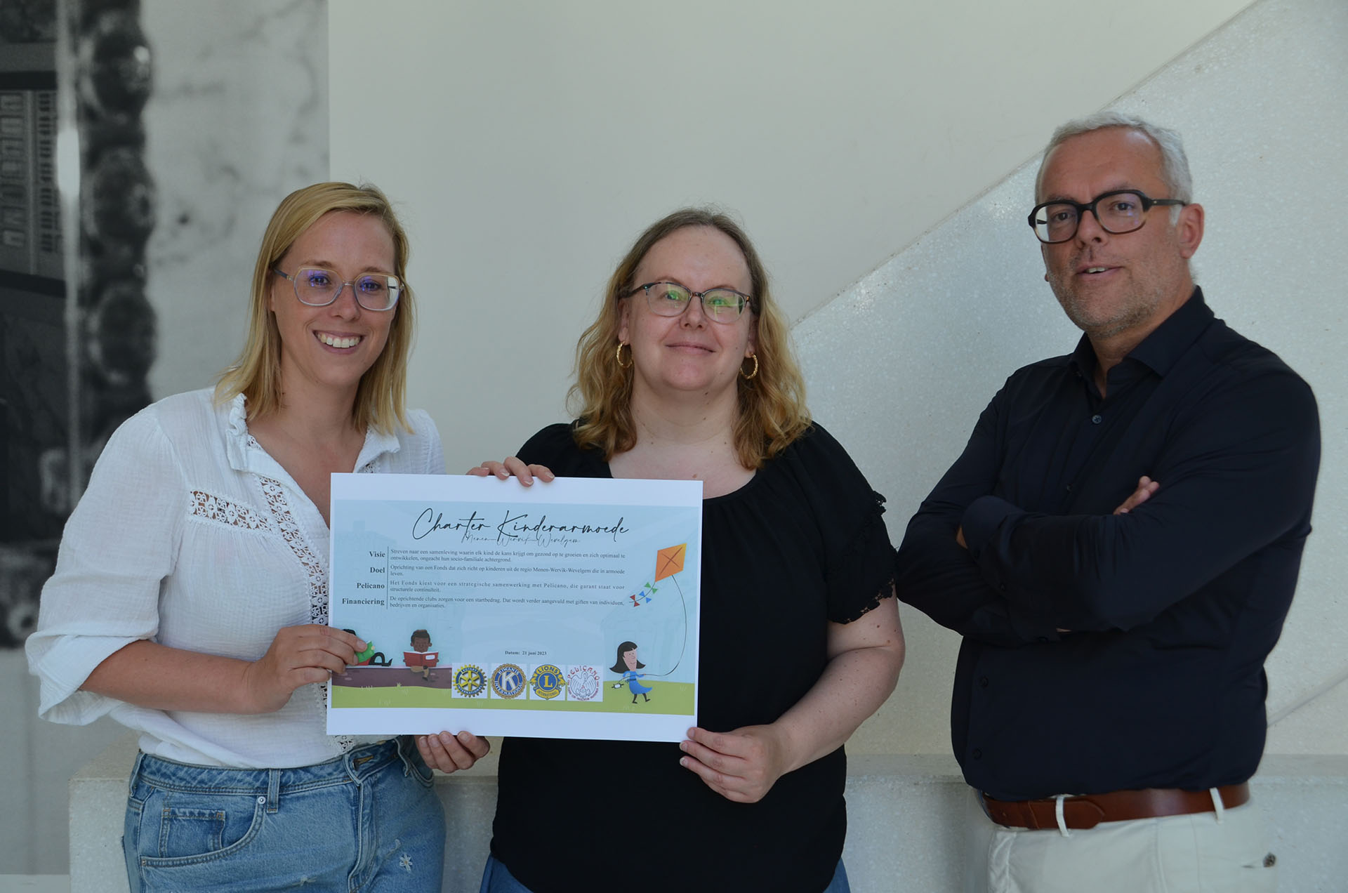 Daartoe ondertekenden vertegenwoordigers van drie serviceclubs op woensdag 21 juni ’23 een charter in het Menense stadhuis. Met de onderschrijving van het charter engageren Rotary Club Menen, Kiwanis Wervik Tabakstreek en Lions Club Menen er zich toe de koe bij de horens te vatten. Samen richten ze een fonds op waarin jaarlijks gezamenlijke middelen worden samengebracht om initiatieven te nemen tegen kinderarmoede.